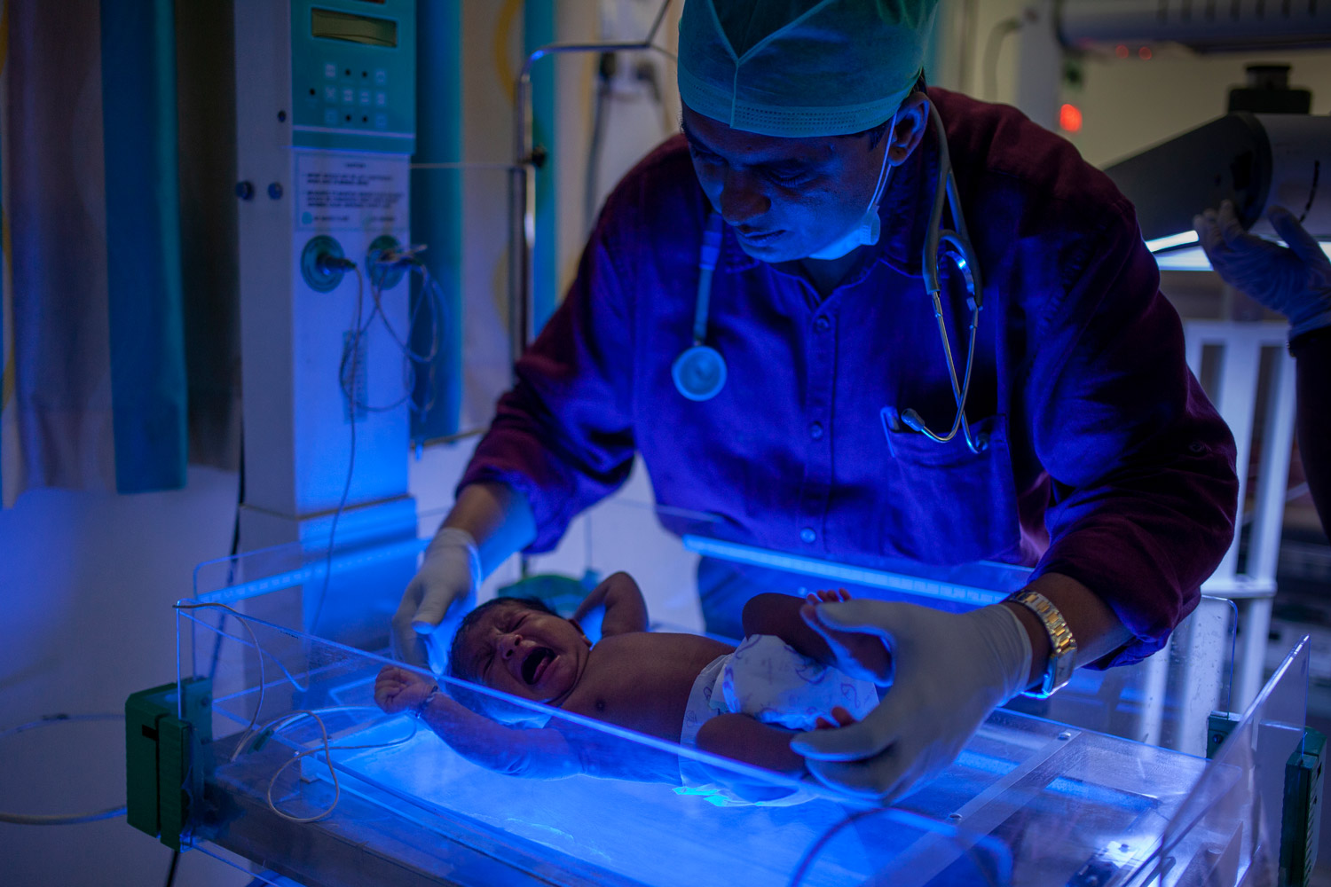 Dr Rakh and a nurse examine a crying newborn girl in the incubator.