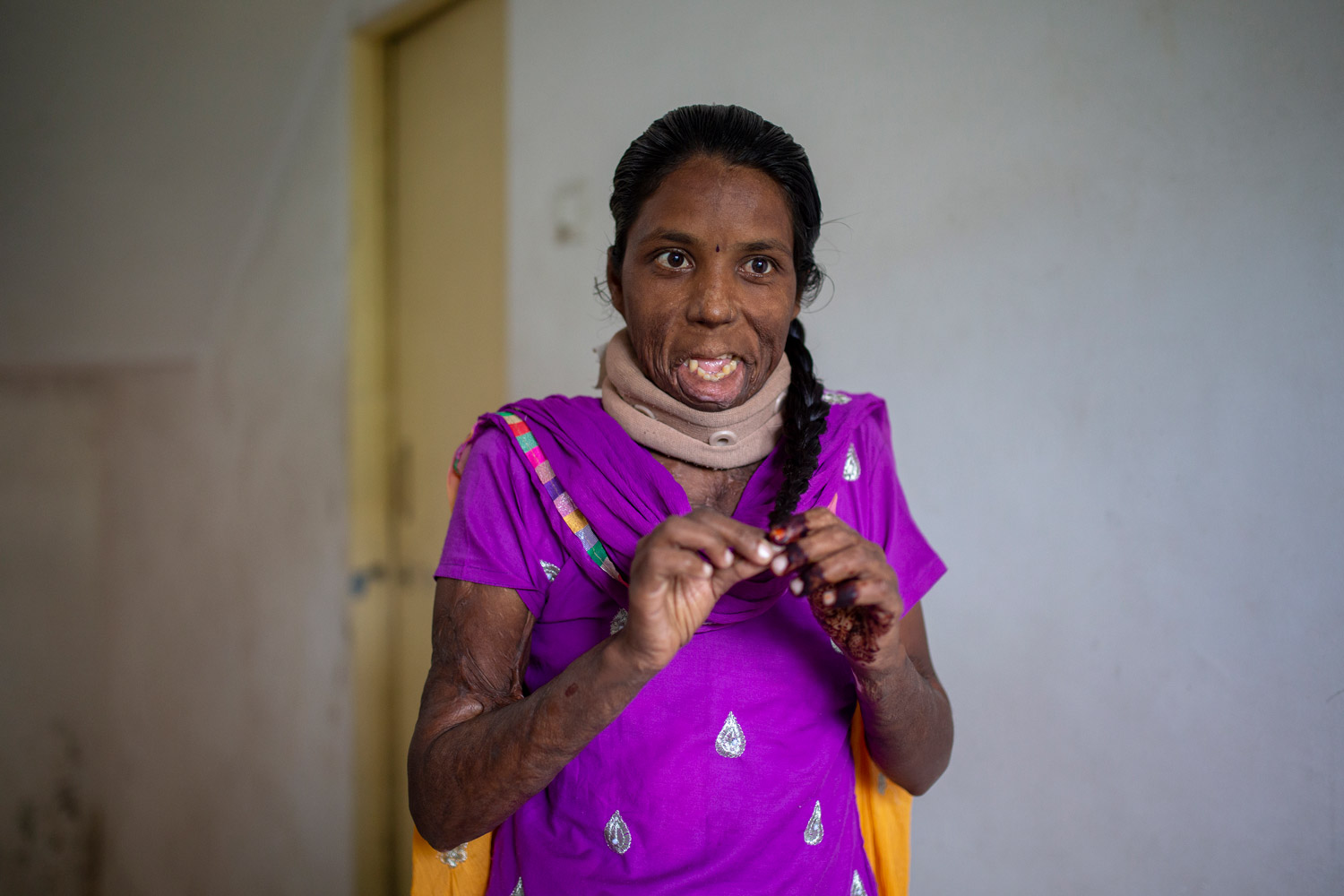 Back in 2016, eight years after the attack, Jaya laid in a cot in the intensive care unit, wearing a faded red nightgown with the hospital’s name embroidered in yellow letters. Sitting at the foot of her bed, her brother Satish spent time helping to balance the hospital’s pharmacy bills. They had been in the hospital for days, waiting for Jaya to gather enough strength to endure one of the many surgeries required to undo the damage the acid had wrought on her body. She was so weak that the nurses had to collect blood to test from her ankles.